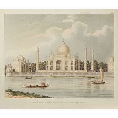 (Early Travel & Ethnography) 1 Vol. Forest, Charles Remus. A Picturesque Tour along the Rivers Ganges and Jumna, in India. London: Ackermann, 1824. Ex-libris. 4to, rebound in modern green library buckram, all edges gilt, gilt-stamped title on spine, library call number on tail, exterior otherwise very tight and bright. With folding map and 24 plates, all hand-colored; library bookplate on front pastedown, also armorial bookplate; library perforation on title page affecting plate lower left (2 1/2 inches), very lightly toned passim but an otherwise bright and attractive copy.