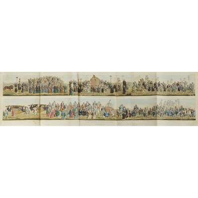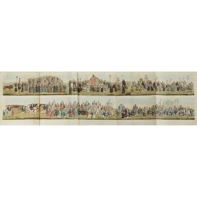 (Early Travel & Ethnography) 1 Vol. Titsingh, Isaac. Illustrations of Japan. London: Ackermann, 1822. 4to, rebound in modern green library buckram, top edges gilt; spine panel cracked and loose, corners bumped and rubbed, some scuffing, library call number lower spine. With 25 hand-colored plates on 13 sheets (1 folding) and 2 aquatints; library bookplate on front pastedown, title page slightly toned with library perforation lower right affecting. Very full margins, internally extremely clean with crisp and bold original color.