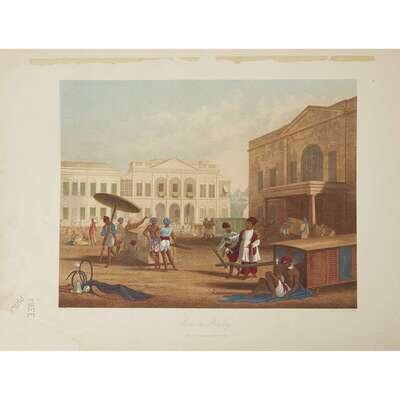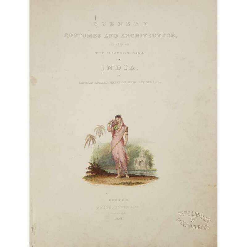 (Early Travel & Ethnography) 2 Vol. Grindlay, Robert. Scenery, Costumes, and Architecture, Chiefly on the Western Side of India. London: Smith, Elder, & Co., 1826-30. 2 vol. in 1. Folio, rebound in modern brown library buckram; title gilt, library call number on tail. With engraved title and 36 hand-colored plates, untrimmed, original glassine to 20 plates; library book plate on front pastedown, library perforated stamp on title page, all plates with library perforated stamp not affecting plates, some chipping.