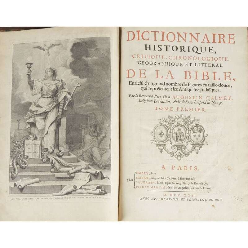 (Early Printing) 4 Vols. Calmet, Augustin. Dictionnaire historique, critique, chronologique, geographique et litteral de la bible. Paris, 1722-1728. Folio, contemporary calf; rubbed and worn, spines variously defective. With approximately 204 plates - maps, views, etc., many double page. Scattered, generally light foxing and spotting, marginal dampstaining virtually throughout vols. 2-4; body of plates mostly not affected.