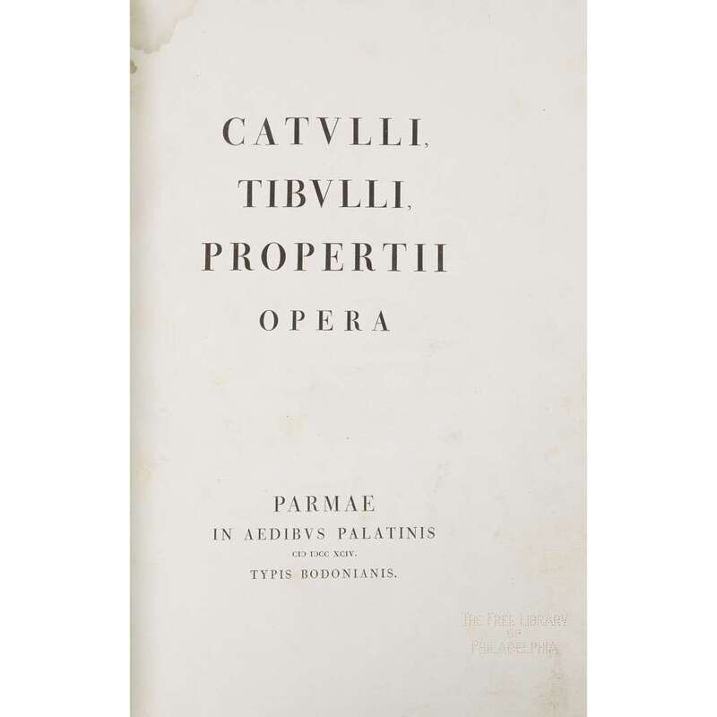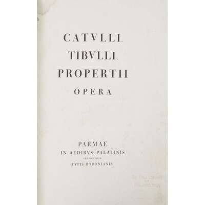 (Early Printing) 1 Vol. Catullus, Tibullus, and Propertius. Opera. Parma: Bodoni, 1794. 1/200 copies. Ex-libris. Folio, contemporary red straight-grained morroco, gilt-stamped, all edges gilt; library call number on tail, spine cover browned, some scuffing, back cover affecting by damp. Internally generally clean but with scattered foxing and damp-staining to upper margin left; library bookplate on front marbled endpaper, library perforated stamp on title page not affecting text.