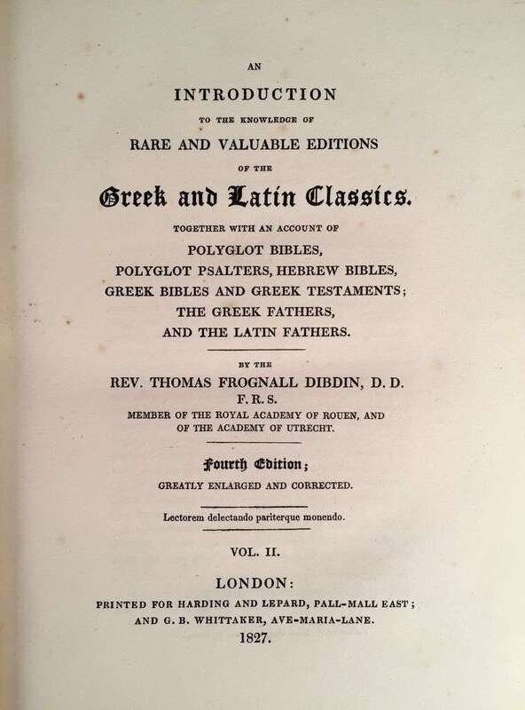 (Early Printing) 2 Vols. Dibden, Thomas Frognall. An Introduction to the Knowledge of Rare and Valuable Editions of the Greek and Latin Classics. London: William Nicol, Shakespeare Press, for Harding and Lepard. 1827. Fourth edition, 1/250 large paper copies. Large 8vo, contemporary full gilt-paneled red morocco, richly-gilt spine compartments, all edges gilt, inner dentelles gilt; re-backed original spines laid down. With engraved plate (foxed), and proof leaf from Pickering's miniature Greek Testament mounted on p. 166 of vol. 1. Complete with half titles. Internally generally clean. Bookplates of Benjamin Hicklin and Arthur Gale.