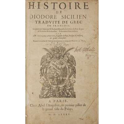 (Early Printing) 1 Vol. Diodorus Siculus [in French]. Paris, abel l'allengier, 1585. Translated by Macault, M. R., and Amyot, Jacques; commentary and appendix by le Roy, Loys. Folio, margins trimmed to 330mm x 220mm. Ex-libris, professionally and tightly rebound in early 20th-century library buckram; benefactor's bookplate on front paste-down, modern endpapers. Appears to lack final blank seen in other copies but text collates complete with 686pp and 12pp index: [24] 151 [1]; [4] 153 686 [14]. Some toning and browning throughout, minor ca. early 20th-century repairs to title page inner margins. 17th- and 19th-century ownership inscriptions in ink on title page. See USTC 20864.