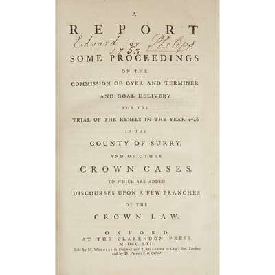 (Early Printing) 1 Vol. (Foster, Michael.) A Report of Some Proceeding on the Commission of Oyer and Terminer and Goal Delivery for the Rebels in the Year 1746 in the County of Surry and of other Crown Cases. To which are added Discourses upon a Few Branches of Crown Law. Oxford: Clarendon Press, 1762. First edition. Folio, old calf-backed, paneled sheep; occasionally rubbed, new endpapers. Internally clean, leaf size 316 mm, ink ownership of Edward Phelips, dated 1763 on title-page, book plate of Owen Biddle on front pastedown. Collated complete.