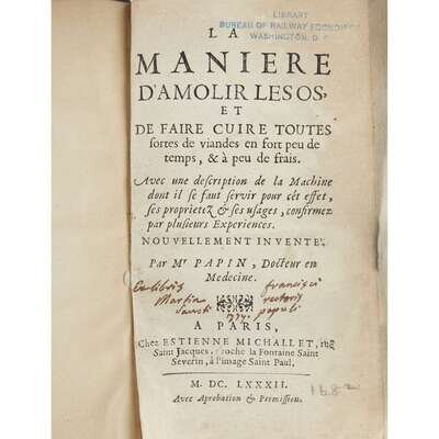 (Early Printing) 1 Vol. Papin, Denis. La maniere d'amolir les os, et de faire curie toutes fortes de viandes en fort peu de temps, & a peu de frais. Paris: Estienne Michallet, 1682. 12mo, contemporary mottled calf, later morocco spine label; scuffed, corners rubbed, spine desiccated, later endpapers and binder's blanks. Folding plate at back. 18th-century ink annotations on title page. Stains at bottom front matter gutters and bottom gutters of first signatures, but internally generally clean. Ex-library ink stamp at head of title page, on verso of title-page and at foot of last text page. 6 preliminary leaves, (1)-158 p., fold plate. First French-language edition, complete but without the supplements (p. 159-164 and Comiers' plate).
