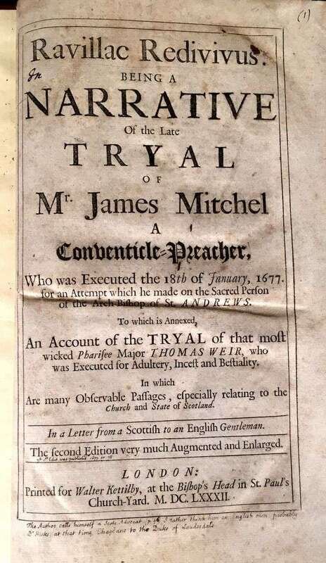 (Early Printing) 1 Vol. (Hickes, George.) Ravilliac Redivivus. ...Narrative... Tryal of Mr. James Mitchel... Executed... attempt... on the Arch Bishop of St. Andrews... An Account of the Tryal of... mThomas Weir... executed for Adultry, Incest and Beastiality. London: for Walter Kettilby, 1682." Second Edition... Augmented. Folio, 19th-century boards; spine rubbed and chipped. Some toning and light foxing to tittle page. Internally generally clean. Old ink annotation in small neat hand below bottom title rule.