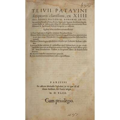 (Early Printing) 1 Vol. Livius, Titus. T. Livii Patauini scriptoris clarissimi ex XIIII decadibus historiae Romanae ab vrbe condita, decades, prima, tertia, quarta, & quintae dimidium. Paris: Michaelis Vascosani, 1543. Folio, old vellum over boards, upper fore edge of front cover gnawed, but binding intact and otherwise lightly to moderately worn. Light spotting to title page, some dampstaining to head and bottom fore edge of title page and first several signatures. Crosby Gage library label on front pastedown, ink control number at foot of title page. Some scattered foxing, but internally (beyond first signatures) generally clean. [48], 248, [16], 66, [28] leaves.