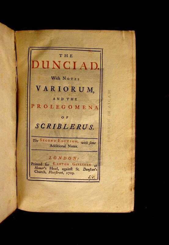 (Early Printing) 2 Vols. Pope, Alexander: On the Uses of Riches, an Epistle to the Right Honorable Allen Lord Bathurst. London: J. Wright for Lawton Gilliver, 1732. First edition, first issue. Folio, 19th-century calf and marbled boards; edge wear. Internally generally clean, old ink numerical annotation at top margin of title page. (ii), 1-20. Rothschild 1605. * The Dunciad with Notes Bariorum, and the Prolgomena of Scriblerus. London: for Lawnton Gilliver, 1729. "Second Edition, with some additional notes." 8vo, contemporary blind paneled calf, morocco spine label; corners and extremities rubbed, joints cracked. Bound with: Love of Fame... London: J. Tonson, 1730. "Third Edition." 8vo. Internally clean.