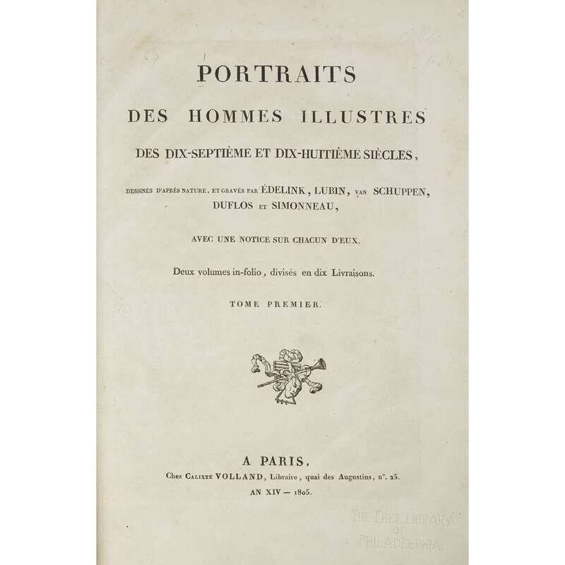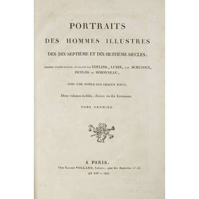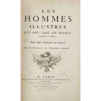 (Early Printing) Lot. 2 Vols Engraved Prosopography: Perrault, Charles. Portraits des hommes illustres. Paris: Dezallier, 1696. 2 volumes in 1, volume one with separate engraved title. See: Brunet IV 509-10. * (Later, related title): Portraits des hommes illustres. Paris: Volland, 1805.