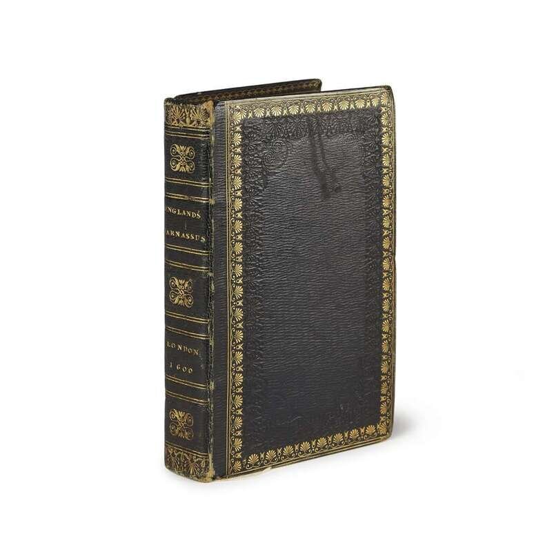 (Early Printing) 1 Vol. (Shakespeare, William, et al.). [Allot, Robert.] [Englands Parnassus: or The Choycest Flowers of our Moderne Poets,...] [London], [1600]. Small 8vo, early 19th-century gilt paneled and foliate black straight-grained black morocco, gilt spine compartments, joints and extremities scuffed. Lacking signature A (preliminary leaves and title), lacking leaf K2 and leaves 2k4-8; leaves K3-7 sprung; heads shaved or shaved close. Occasional old ink annotations, but internally generally clean. Early 19th century book plate of Joseph Tasker on front paste down. In custom gilt paneled blue morocco slip case and cloth chemise.
