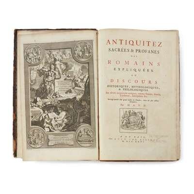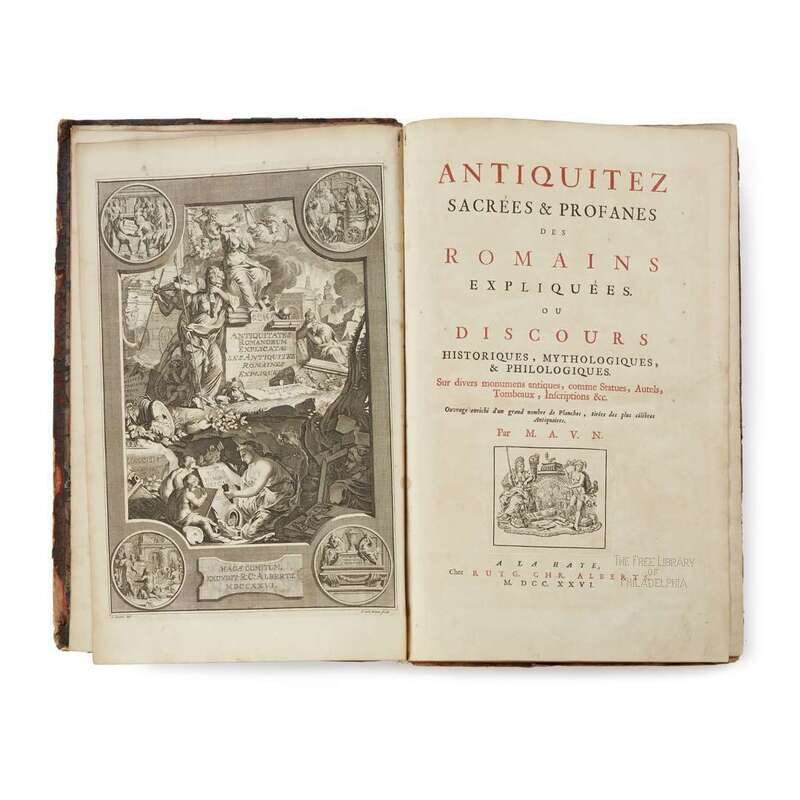 (Early Printing) 1 Vol. Van Nidek, A. Antiquites sacrees et profanes des romaines. The Hague: R.G. Alberts, 1726. Parallel text in Latin and French with two separate title pages as such, each engraved. Engraved frontis and 86 pages engraved plates. Folio, old calf; covers scuffed, chipped and detached but present. Internally generally clean but with front and end matter loose, library perforated stamp on French-language title page.