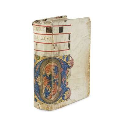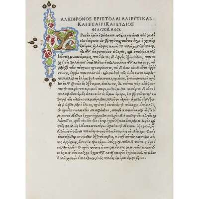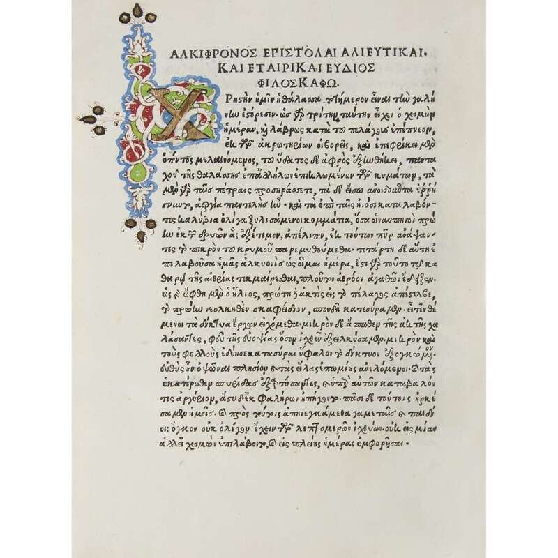 4to, 215mm x 155mm (top margin thus trimmed 5mm). Gilt-illuminated ca. 15th-century (or earlier) antiphonal leaf over boards, gilt title upper spine (in Greek) "Epist(olai) Philosoph(on)", gilt "1499" partially obscured on tail; some soiling (especially at joints and back panel), chipping and minor loss of vellum at edges, splits owing to desiccation at front panel upper hinge (7cm) and lower hinges (2cm) not affecting boards or soundness. Vestigial cataloger's fore-edge titles in brown ink, toned, shelf-marked "epistolae diversoru(m)", "(apud Aldum, Musurus edidit)." Modern re-casing, modern end-papers. Internally bright, crisp; most gatherings likely washed (but compare in contrast browning at Part I gathering "zeta"). Gilt-illuminated chapter headings. 26 lines text 148mm x 100mm. Types 2:114R (titles, colophons) and 2:114Gk (text).