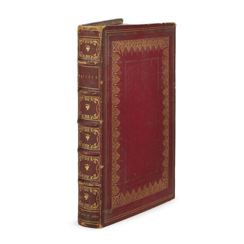 Folio, mid 19th-century red morocco gilt, raised bands, spine compartments gilt, t.e.g., marbled endpapers; hinges not quite starting, corners slightly bumped, some scuffing and rubbing but altogether very bright. Old (contemporary?) hand-colored initials at incipit Praefatio (folio 1 recto) in green ink; at Historiae (folio 2 recto) in blue and red ink, with initials at book headings in blue ink passim; at Germania (folio 151 recto) in blue ink; at Dialogus de Oratoribus (folio 161 recto) in blue ink; and at Agricola (folio 177 recto) in blue ink. Text complete in altogether 187 leaves, 160 and 176 blank; lacks blank 188. No title page or pagination, as called-for; later foliation in pencil lower left, very unobtrusive. Leaves likely washed ca. early 20th century (?), excepting Praefatio (folio 1) and Agricola (folios 176-187), both rather more browned and toned; unobtrusive pinhole-size worming at Agricola folios 176-187, dampstaining, too, to margins of final text leaf 187 (not affecting text). Top margin appears slightly trimmed. 293mm x 204mm. See: Goff T-7.