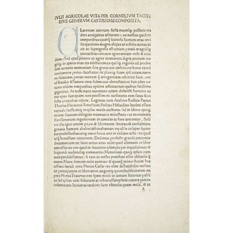 (Early Printing : Incunabula) 1 Vol. Tacitus, Publius Cornelius. Opera (ed. Puteolanus). [Milan: Antonius Zarotus, 1475-1487]. Second printed edition of Tacitus' extant writings, such as they were known prior to the rediscovery of Annales I-VI. Improving upon the editio Spirensis (ca. 1470), Puteolanus' text contains the editio princeps of the Agricola and expanded portions of the Histories.