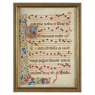 (Manuscripts : European). 1 Piece. Melismatic Antiphonal Leaf on Vellum. Octava Nat. Domini. Folio. 5 bars music with historiated Marian initial (recto), 5 bars music with decorated initial (verso). Stave in red, square notation in black, florid rubrics, illuminated marginal odonata and other drollery. Continental monastic production, ca 15th century (or earlier).
