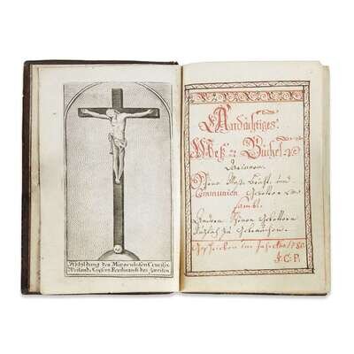 (Manuscripts : European). German-language Devotional Handbook for the Day of Communion. Continental (likely household) production, 1780. 12mo. 147pp text, 148 blank with manuscript calculations in black ink. Engraved staurological frontis, engraved plates tipped in passim, chiefly hagiographical. Ruled borders in meandering red and blank ink patterns, tailpieces in the Fraktur idiom and often florid as such. Rubrication passim, chiefly in context of petionary prayer and liturgical moments of import. Old calf slipcase ad hoc.