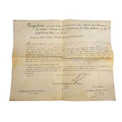 (Autograph Material) 1 Piece. Document Signed. Napoleon I. May 27, 1812. 1 p., folio on vellum (17 x 21 1/2 inches; 430 x 546 mm); creases along old folds. Partly printed, filled in in manuscript. Pardon for Joseph Pages, fusilier of the Batallion of the National Guard following his court martial. Strong, generally dark Napoleonic signature on clean attractive document.