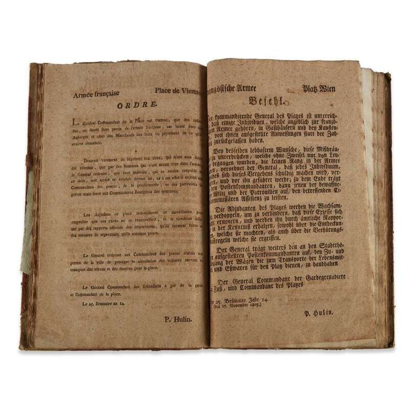 (Printed Propaganda - Collaborationism) 1 Vol. (Napoleonic Wars - First French Occupation of Vienna). Bound Collection of Letterpress Bulletins, Ordinances, Orders, Proclamations &c. Vienna, ca. October 1805-January 1806. Folio, contemporary boards, quarter vellum back and corners; moderate wear. No title page, but with early ownership inscription in ink on front free endpaper (perhaps that of the original printer/compiler). Holding over 80 French and German language letterpress documents - large and small folio broadsheets, and a few paginated pieces. Many uncut, as issued, all crisp and intact, some toned and showing scattered light foxing. Many examples of parallel French- and German-language iterations of the same document. Topics include redistricting, citizen registration, renunciation of inherited titles, garrison rations and reallocation of foodstores, &c.
