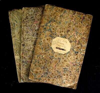 (American Manuscripts & Autographs) 3 Vols. Palimpsestic Manuscript Business Ledgers. (Evans, Martin et al). (Philadelphia, PA). "Day Book and Journal, January 28, 1842"; "Ledger Book, 10 February, 1842"; "Cash Book, 24 February, 1842." Each in 4to in original marbled boards. Merchants' names roughly but deliberately obliterated in brown ink on the label each volume, with uncertain gloss "Martin Evans. Horatio Allen. Bryn Mawr Station" added in pencil, in a later hand, on paper label of "Day Book and Journal." Approximately 40pp each, the majority of which pasted over with later newsclippings, all consistently reflecting abolitionist affiliations and pacifist leanings; some pages do nevertheless evidence original manuscript clues such as "Dublin", "flaxseed", &c, many clippings having come loose. Significantly later news news fragments (ca 1870, terminus ante quem) treat race and demography ("Early Slavery in Massachussetts" and "Negroes in Railway Cars"); medical oddities ("Besieged by Famished Cats") and antisocial behavior; travel ("Cheap Living in Germany"); and current events, often of the Civil War era ("The Burial Place of Booth." Provenance: By family descent.