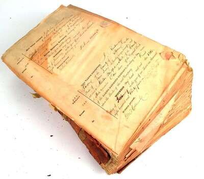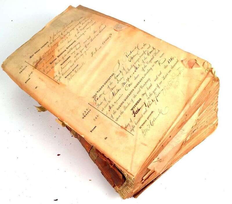 (American Manuscripts - Economic History) Lot of 8 Manuscript Ledgers, all relating to Salem Banking Company. Salem, NJ. Records taken together comprehend ca. 1824-1858: (Record of Cash Deposits). September, 1829 - April, 1832. 181pp, 178 of which filled-in. Oblong folio, rough half-calf and marbled boards; spine cover chipped and dessicated, boards rubbed and distressed. Browned and toned. * (Dividend Book). ca.1824 - 1859. Folio, half rough-calf and marbled boards; scuffed and soiled. * "State of the Bank." Commercial banking transactions. December, 1847 - March, 1853. Approx 200pp filled-in. Folio, blindstamped rough calf, red morocco label gilt; wanting back panel, backstrip detached but present, generally soiled. * (Register of Stock Sales and Transfers). ca January, 1835 - May, 1865. 362pp filled-in, 33pp unused slip. Folio, half rough-calf over boards; wanting front panel and backstrip.* (Letter Book). Retained copies. 1823 - 1842. Approximately 250pp, of which 32pp filled-in, others blank. Folio, half rough-calf; soiled, lacking backstrip. * (Record of Settlements). Ca 1848 - 1853. 213pp filled-in. 1853. Folio, three-quarter rough calf blindstamped, marbled endpapers; soiled and dusty. Eli Adams' binder's ticket on ffep verso. * (Cash Book). ca. 1834 - 1846. 159pp. Folio, half rough-calf and boards; backstrip gone. * (Record of Loans). April, 1827 - March, 1831. 45pp filled-in, 76pp blank. Folio, half rough-calf and marbled boards; overall in far better state of preservation than the foregoing 7 ledgers.