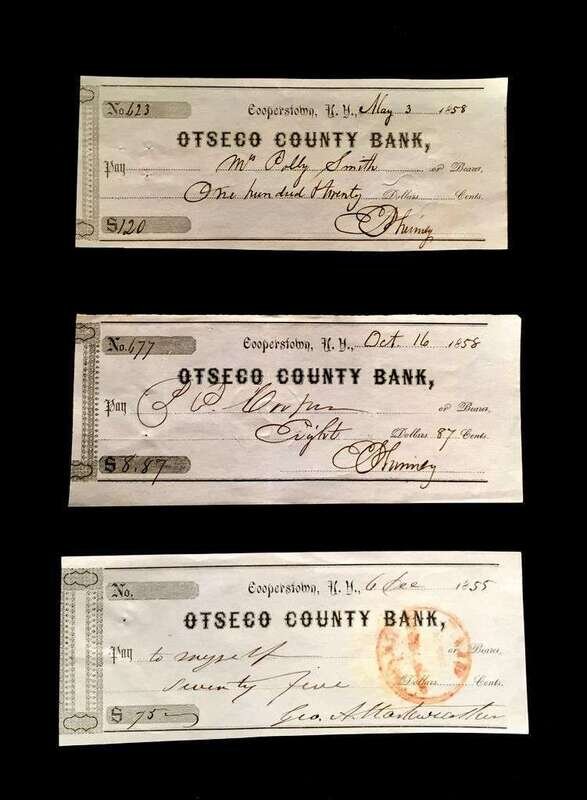 (American Manuscripts & Autographs) 3 Pieces. (Abner Doubleday Cooperstown associations.) Checks Signed: Phinney, E.(Lihu)( Jr.) Cooperstown, New York: Ostego County Bank, May 3, 1858; October 16, 1858. 2 signed checks 2 3/4 x 6 3/4 inches; 75 x 175 mm. Crisp and clean, dark, strong signatures. * Starkweather, Geo(gre) A. Cooperstown, New York, December 6, 1855. 2 3/4 x 6 3/4 inches; 75 x 175 mm. Crisp and clean, clear unfaded signature.
