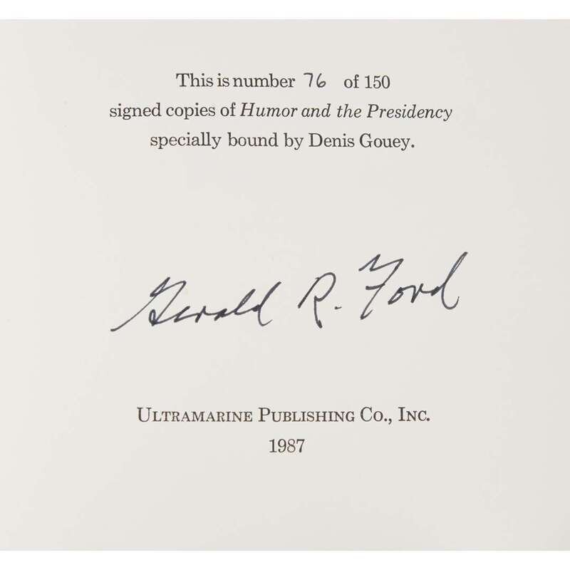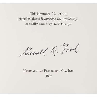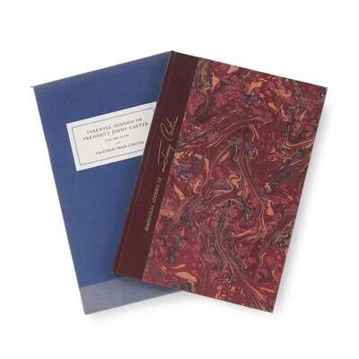 (American Manuscripts & Autographs) 3 Vols. American Presidents: Carter, Jimmy. Farewell Address of President Jimmy Carter. Palaemon Press, (1981). #170/300. 8vo, original blue cloth, gilt-lettered cloth, blue cloth slipcase with paper label. Signed by Jimmy Carter on title page. Some fading at bottom of slipcase. * Carter, Jimmy. Inaugural Address of. Washington: The White House, Christmas, 1977. 4to, original brown morocco, gilt and marbled boards. Proof copy. Minor wear. * Ford, Gerald R. Humor and the Presidency. New York: Arbor House, 1987. #76/150 signed by Gerald R. Ford. 4to, original crushed brown morocco and marbled boards, gilt-lettered spine, by Denis Gouey. Minor wear.