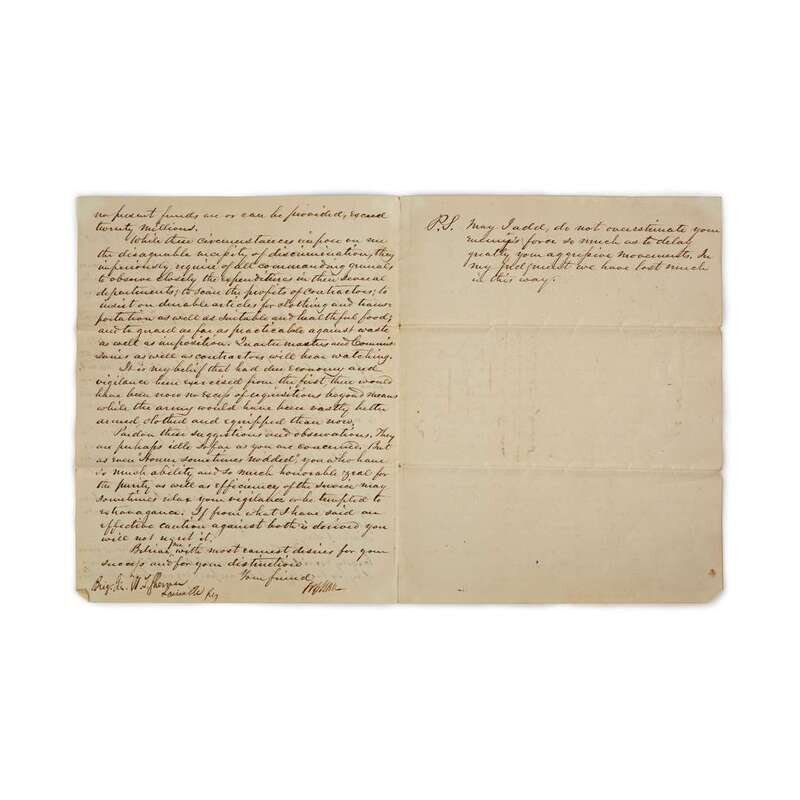 (American Manuscripts & Autographs) 1 Piece. Letter Signed. Chase, S(almon) P. Washington, October 13, 1861. 2 1/4 p.; light creasing along old folds, a few small dust smudges. Docketed. To Brigadier General W(illiam) T(ecumesh) Sherman, "... I wish I could have said absolutely that all requisitions for your troops will be immediately responded to... But there is a limit to possibilities..." [expounding at some length on the financial exigencies of the war] [and ending with a post script], "...do not overestimate your enemy's force so much as to delay greatly your aggressive movements. In my judgement we have lost much in this way." Signed as Secretary of the Treasury.