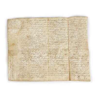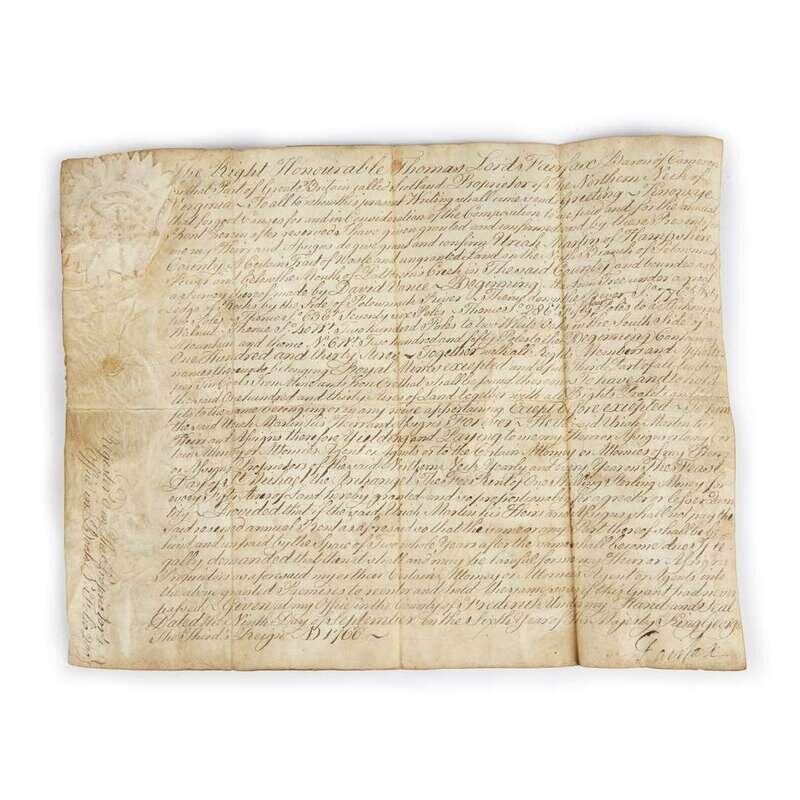 (American Manuscripts & Autographs) 1 Piece. (Autograph material). Fairfax, (Thomas, sixth Lord Fairfax of Cameron, proprietor of the Northern Neck of Virginia.) Manuscript Document Signed. Frederick County, Virginia, September 9th, 1766. 9 x 11 1/2 inches; 228 x 292 mm, on vellum, with paper seal; darkened and somewhat dampstained, but entirely legible with clear, generally dark signature. Hampshire County, Virginia [now West Virginia] land deed for 130 acres to Uriah Martin.