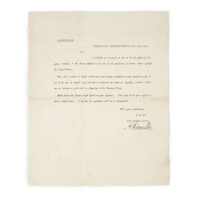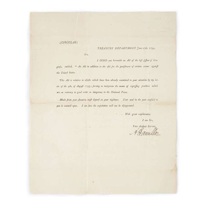 (American Manuscripts & Autographs) 1 Piece. Document Signed. Hamilton, A(lexander). [Philadelphia?], June 17, 1794. Printed Treasury Department Circular, "I send you herewith an Act of the last congress, entitled 'An Act in addition to the Act for the punishment of certain crimes against the United States'..." 1 p., 4to (9 x 7 1/4 inches; 230 x 183 mm); light creases along old folds, a few small paper separations, center horizontal fold a little discolored, some faint staining, no or negligible paper losses. Dark, strong Hamilton signature, light to moderate vertical crease through the "m" in "Hamilton." Signed as Secretary of the Treasury.