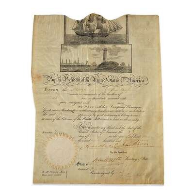 (American Manuscripts & Autographs) 1 Piece. Document Signed. Jackson, Andrew. (Washington), May 3, 1837. 1 p., folio on vellum, vignettes at head of document, paper seal (intact); light creasing and minor wrinkling. Ship's passport for the "Cora." Partly printed, filled-in manuscript. Filled-in manuscript often faded; Andrew Jackson's signature browned but strong, traversed by two light, vertical creases. Countersigned by Secretary of State Louis McClane.