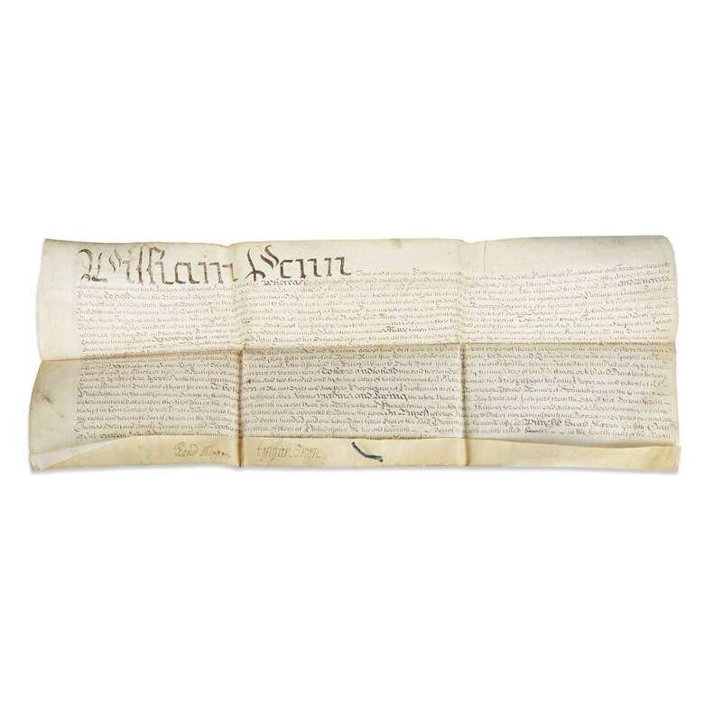 (American Manuscripts & Autographs) (The Deed to Bill Cosby's Property). Logan, James; Shippen, Edward; Owen, Griffith. Document signed. Land grant of 250 acres in Cheltenham, PA, to John Ashmead. Philadelphia, PA, 25 August, 1705. Vellum, 700mm x 260mm. Secretarial composition in brown ink, original folds, original blue silk ribbons; browned with some minor spotting. Signed by James Logan (1674-1751) in brown ink on original fold, lower margin at right; faint but legible. Countersigned by Edward Shippen and Griffith Owen; witnessed but not signed by Thomas Story. Docketed, with clerical imprimatur "Recorded with Roll's Office at Philadelphia in Patent Book…vol : 3 page 168 (October) 19th, 1705."