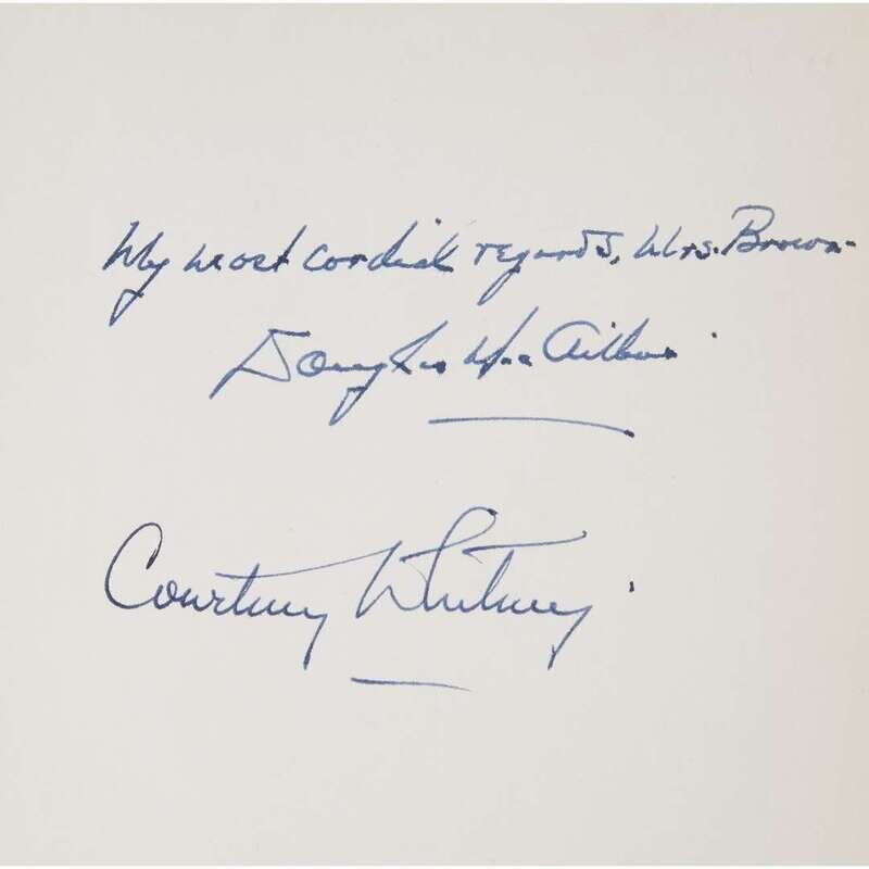 Signed & inscribed in ink on front free endpaper recto by Douglas MacArthur; also signed in ink below MacArthur's signature by Courtney Whitney. Dark, clear inscription and signatures.