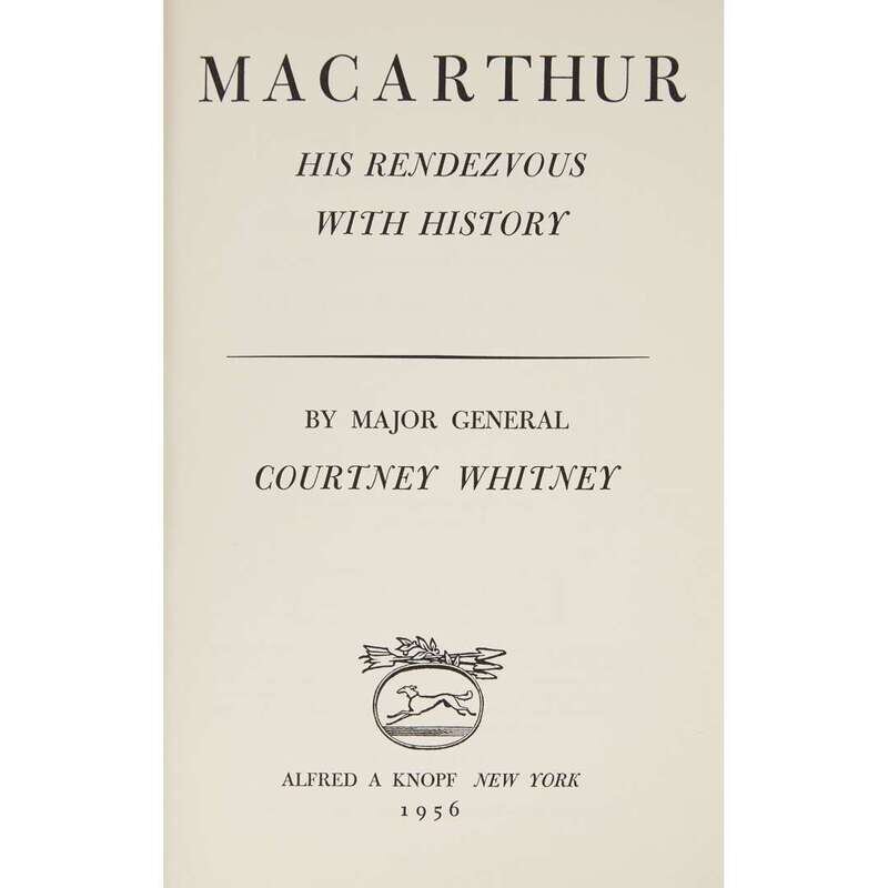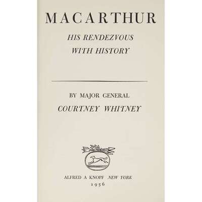 (American Manuscripts & Autographs) 1 Vol. (MacArthur, Douglas). Whitney, Major General Courtney. MacArthur, His Rendezvous with History. New York: Knopf, 1956. First edition. 8vo, original two-tone blue and rust brown cloth; light edge wear, dust jacket (some creasing and chipping at edges - negligible paper loss). In custom quarter blue morocco, gilt, and cloth slipcase and cloth chemise.