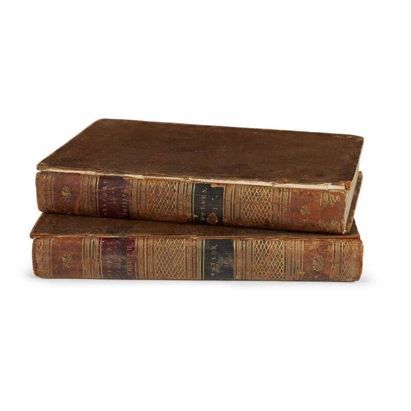 (American Manuscripts & Autographs) 2 Vols. (Monroe, James.) Watson, Robert. The History of the Reign of Philip the Second, King of Spain. London, 1803. The Sixth Edition. Volumes I and II (of 3) only. 8vo, contemporary sheep, spines gilt, morocco spine labels, rubbed and worn, joints tender or starting to separate, front hinge of vol. I broken. Scattered light to moderate foxing. In custom quarter brown morocco, gilt, and cloth clam shell box.