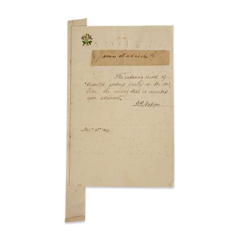 (American Manuscripts & Autographs) 1 Piece. Autogtaph Material. James and Dolley Madison: Autograph Qoutation Signed. Madison, Dorothy Payne Todd, "Dolley." No place, December 30, 1844. 1 p., 12mo. "The enduring record of / departed goodness dwells in the soul / like the writing that is inscribed / upon adamant." Signed as D P Madison. Clean and clear on paper embellished with small watercolor flower and with mounted cut signature of James Madison.