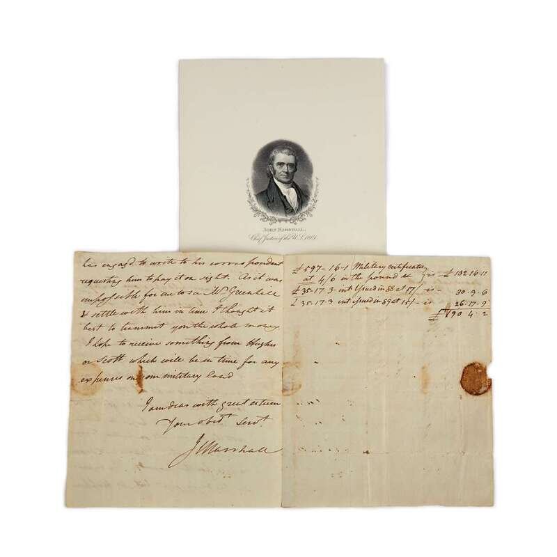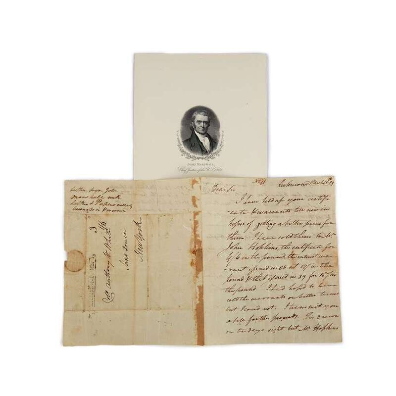 (American Manuscripts & Autographs) 1 Piece. Autograph Letter Signed. Marshall, J(ohn). Richmond [Virginia], March 6, [17]89. 2 1/4 p., with integral address leaf; generally light creases along old folds, minor spotting, some glue residue at joint of integral leaf. Docketed. To Colonel Anthony W. White, "I have held up your certificate and warrants till now in hopes of getting a better price for them. I have sold them to Mr. John Hopkins..." With records of the transactions on recto of integral leaf. Contents and signature clear, clean, and generally dark. Marshall's signature slightly affected by light creasing.