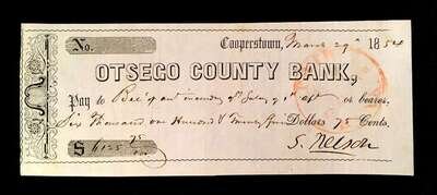 (American Manuscripts & Autographs) 1 Piece. Check Signed. Nelson. S(amuel). Cooperstown, New York: Ostego County Bank, March 29, 1854, 2 1/2 x 6 1/4 inches; 64 x 158 mm. Clean and crisp, strong dark signature.
