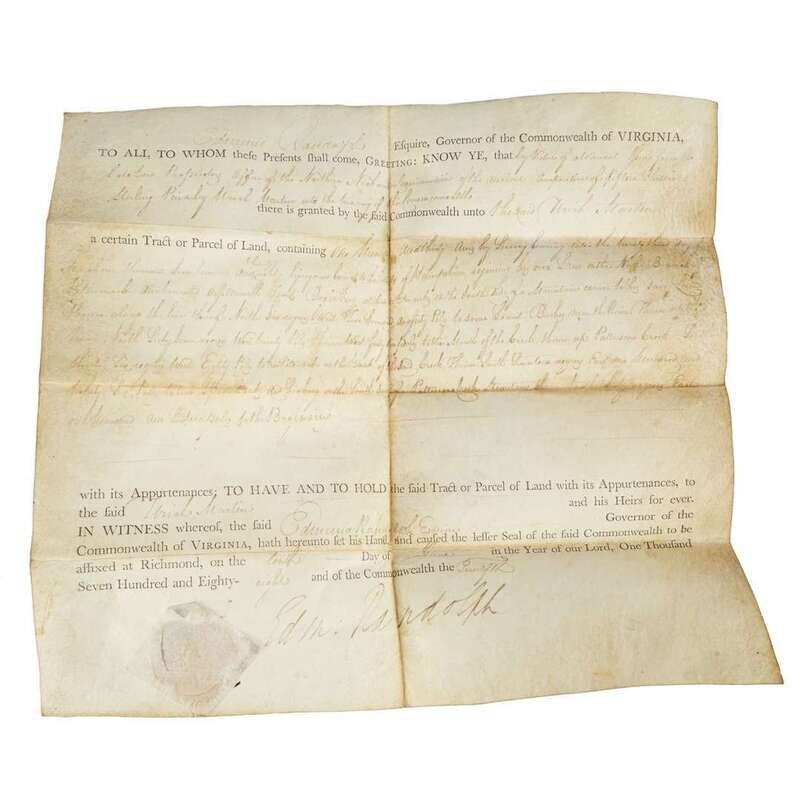 (American Manuscripts & Autographs) 1 Piece. (Autograph material). Randolph, Edm(und). Document Signed. Richmond, June 10, 1788. 13 x 14 1/4 inches; 330 x 360 mm, on vellum, with paper seal, partly printed, filled in in manuscript; creasing and darkening along old folds, ink browning and just starting to fade, signature clear and generally strong. Land grant to Uriah Martin. Signed as governor of Virginia.