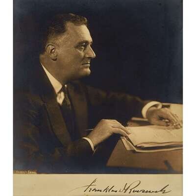 (American Manuscripts & Autographs) 1 Piece. Photograph Signed. Roosevelt, Franklin D. Ca. 1930. Seated silver print photo portrait by Harris & Ewin, 8 5/8 x 6 1/4 inches; 190 x 160 mm. Strong, clear Franklin D. Roosevelt signature below image at right. Generally well preserved photograph in early mat.