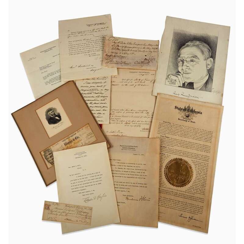 (American Manuscripts & Autographs) 10 Pieces. Autograph Material. United States Supreme Court Justices: Chase, S(almon) P., Document Signed, (Washington): Treasury Department, May 25, 1861, 1 p., 4to, partly printed, filled in manuscript, signed as Secretary of the Treasury. * Ellsworth, Oliver, Manuscript Document Signed, Hartford, Connecticut, October 17, 1773, 1 p., oblong 8vo, pay order. * Frankfurter, Felix, lithographic Portrait Signed, sheet size 12 x 9 1/4 inches; 304 x 235mm. * Hughes, Charles E., Typed Letter Signed, Albany, November 11, 1907, 1 p. 4to, signed as Governor of New York. * Stone, Harlan F., Typed Letter Signed, (Washington), January 31, 1933, 1 p., 4to, on Supreme Court letterhead. * Taft, William H. Autogtaph Letter Signed, Washington, September 17, 1927, 2 p., 8vo, "My dear old friend, I was delighted to receive your note of congratulations on my seventieth birthday..." on Supreme Court Letterhead. Taney, R(oger) B., Document Signed, (Washington): Treasury Department, March 24, 1834, 1 p., 4to, partly printed filled in in manuscript, signed as Secretary of the Treasury. * Vinson, Fred M., Typed Letter Signed, Washington, February 10, 1949, 1 p., 4to, on Supreme Court letterhead. * Wait, M(orrison) R., Check Signed, Washington, October 14, 1879. * Warren, Earl, Document Signed, Sacramento, n. d. (ca. 1943-1953), folio, 1 p. gold seal, signed as Governor of California.