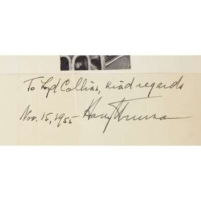 Card inscribed to Loyd Collins dated "Nov. 15, 1955," and signed by Harry S. Truman mounted on front free endpaper recto. Strong, clear ink inscription and signature. * With Harry S. Truman Typed Letter Signed, Kansas City, November 15, 1955. 1 page, 4to, expressing his appreciation and enclosing the card above to A. Loyd Collins, on Truman's Federal Reserve Bank letterhead, strong ink signature, mounted to front free endpaper verso.