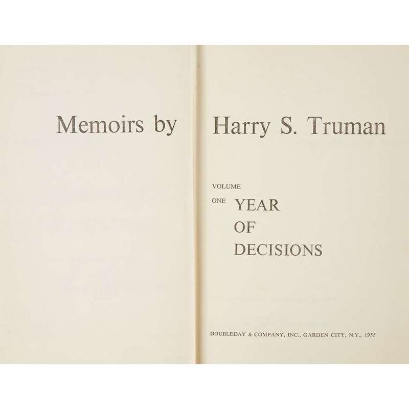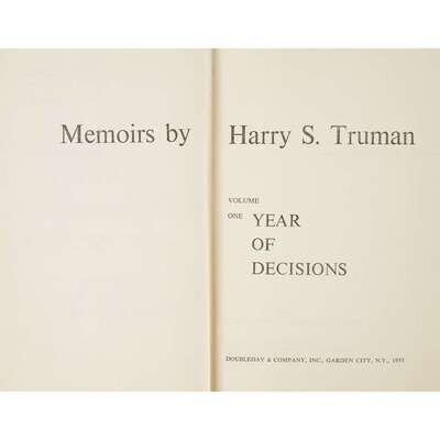 (American Manuscripts & Autographs) 1 Vol. Truman, Harry S. Year of Decisions. Garden City: Doubleday, 1955. First edition. Memoirs, Volume One. 8vo, original black cloth, some scuffing and spotting, dust jacket (chipping at edges, wear at joints, darkening to spine panel, old cello tape repairs at head and foot of spine panel, a little dusty). Clippings and labels on end papers. In custom quarter black morocco, gilt, slipcase and cloth chemise.