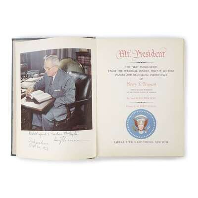 (American Manuscripts & Autographs) 1 Vol. (Truman, Harry S.) Mr. President: The First Publication from the Personal Diaries, Private Letters, Paper and Revealing Interviews of Harry S. Truman, Thirty-Second of the United States of America. New York: Farrar, Straus and Young, (1952). Compiled and edited by William Hillman. 4to, gilt-lettered beige linen-backed green cloth; light to moderate edge wear, a little scuffed. Color frontispiece portrait, color plates, other illustrations. Internally clean. In custom quarter navy blue morocco, gilt, and green cloth slipcase and cloth chemise.