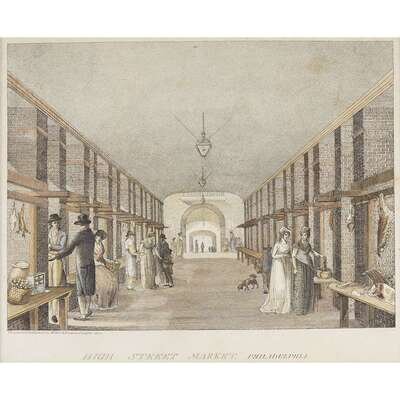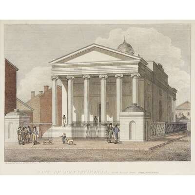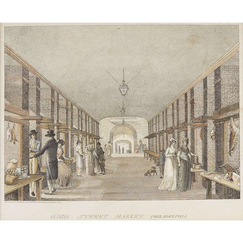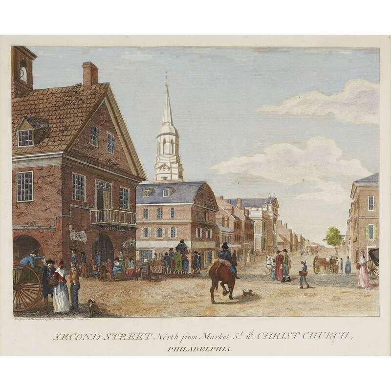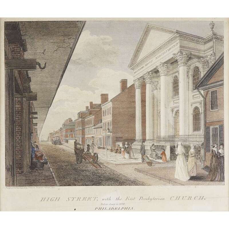(Americana : Historical Prints) 4 Pieces. (Birch's Philadelphia views.) Birch, William. (The City of Philadelphia, in the State of Pennsylvania...): "Second Street North from Market Street with Christ Church. Philadelphia." (Philadelphia), (1804). Second edition. 11 x 12 7/8 inches, 280 x 327 mm, wide margins. Top margin chipped and browned, light mat burn, margins lightly to moderately toned. Image generally clean and bright. Snyder 15b. * "Bank of Pennsylvania, South Second Street, Philadelphia." (Philadelphia), (1804). Second edition. 10 1/2 x 12 3/4 inches; 267 x 324 mm, narrow margins. Light mat burn. Image generally clean and bright. Snyder 36b. * "High Street Market, Philadelphia." (Philadelphia), (1804). Second edition. 10 7/8 x 13 3/16 inches; 276 x 335 mm, narrow margins above and below plate mark, side margins somewhat trimmed. Moderate mat burn, lightly to moderately toned, dampstain at upper left corner, touching image. But image generally bright and clean. Snyder 31a. * "High Street, with the First Presbyterian Church, Taken down in 1820. Philadelphia." (Philadelphia, ca. 1860s). McAllister restrike. 11 x 12 3/4 inches; 280 x 323 mm, narrow margins. Moderate mat burn, some toning and light creasing.