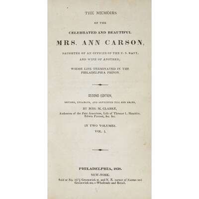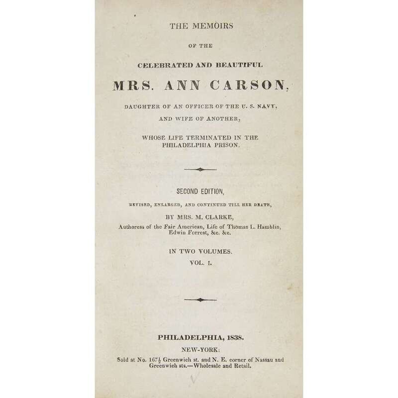 (Americana : Crime : Gender) 1 Vol. Carson, Ann Baker, et al. The Memoirs of the Celebrated and Beautiful Mrs. Ann Carson... Whose Life Terminated in the Philadelphia Prison. Philadelphia; New York, 1838. Second edition. 2 vols. in 1, 12mo, contemporary half calf and boards; front cover detached but present. Internally generally clean.