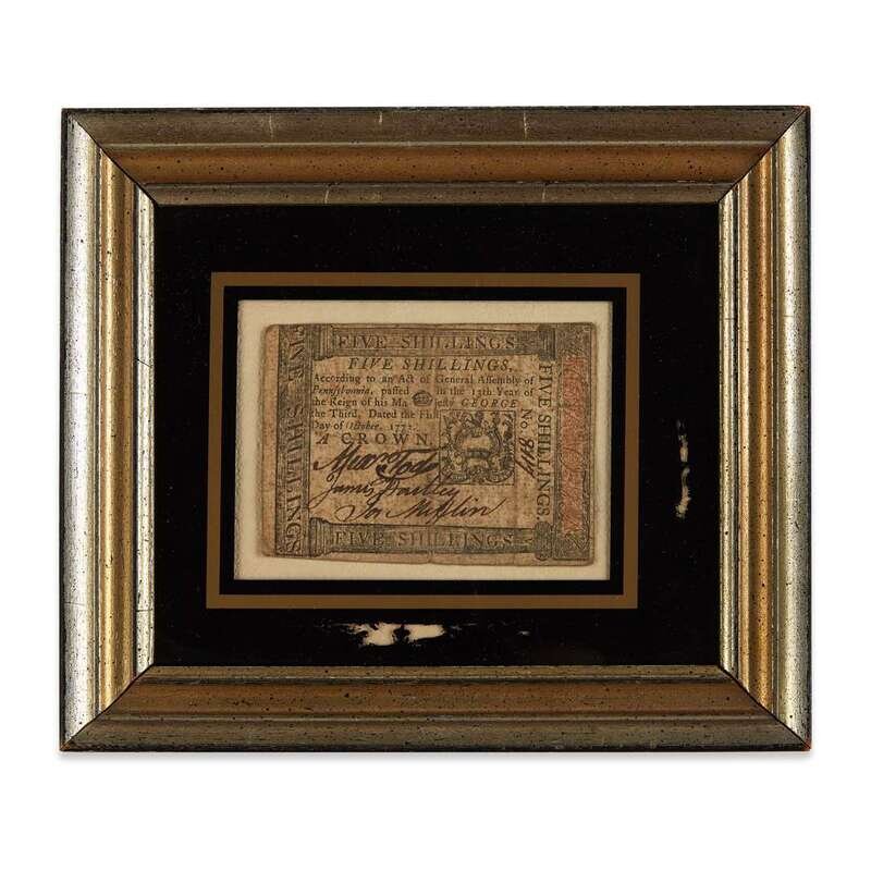 (Americana : Economic History). Mifflin, et al. 3 pieces Colonial Currency Signed: Pennsylvania currency note, "Five Shillings. no. 8117." 3 5/8 2 5/8 in; 92 x 67 mm. Signed by Thomas Mifflin, countersigned by merchants Alexander Tod & James Hartley. Good-plus condition, corners slightly dulled, light creasing. Attractively framed. See: Friedburg PA-166. * Pennsylvania currency note, "Five Shillings. no 7311." 3 5/8 x 2 5/8 in; 92 x 67 mm. Signed by Philadelphia merchants John Field, Thomas Meredith, & Abner Usher. Good-plus condition, corners slightly dulled, light creasing, one (1) 1mm pinhole. Attractively framed. See: Friedburg PA-166. * Lot also includes Maryland Currency Note, "Half.Dollar no.2514." See: Friedburg MD-64.