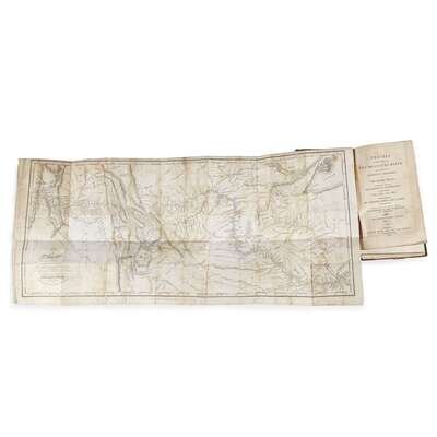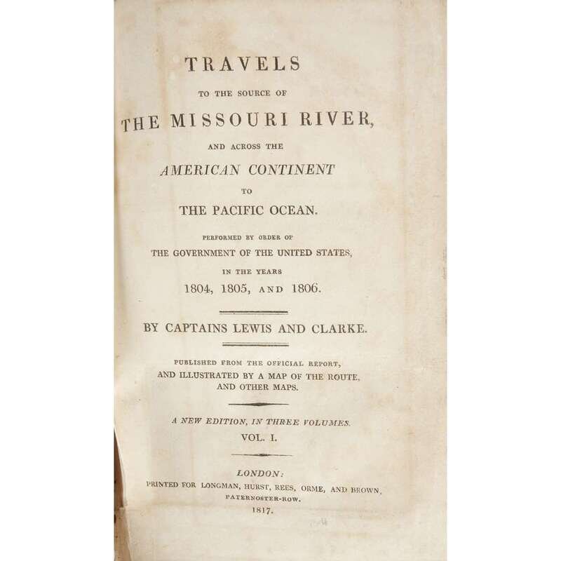 (Americana : Travel & Exploration) 3 Vols. Lewis, (Meriwether) and Clark, (William). [History of the expedition] Travels to the Source of the Missouri River and Across the American Continent to the Pacific Ocean. London: Longman. Hurst, Rees, Orme, and Brown, 1817. Contemporary half calf and boards; rubbed and worn, spines and cornes dedicated; several covers detached. With large folding map (moderately foxed, a few repairs to verso, occasional short separations along folds) and 5 other maps. Light to moderate foxing to front and back matter, other scattered, generally light foxing, moderate off setting from maps. Title-page and fold map in vol. 1 sprung. Complete with half title in vol. 2.