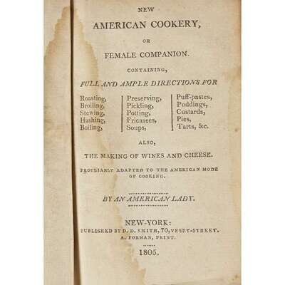 Regarded as the second cookbook by an American author; more scarce than the first cookbook by an American author, Amelia Simmons, Hartford 1796. The above is the first cookbook published in New York.