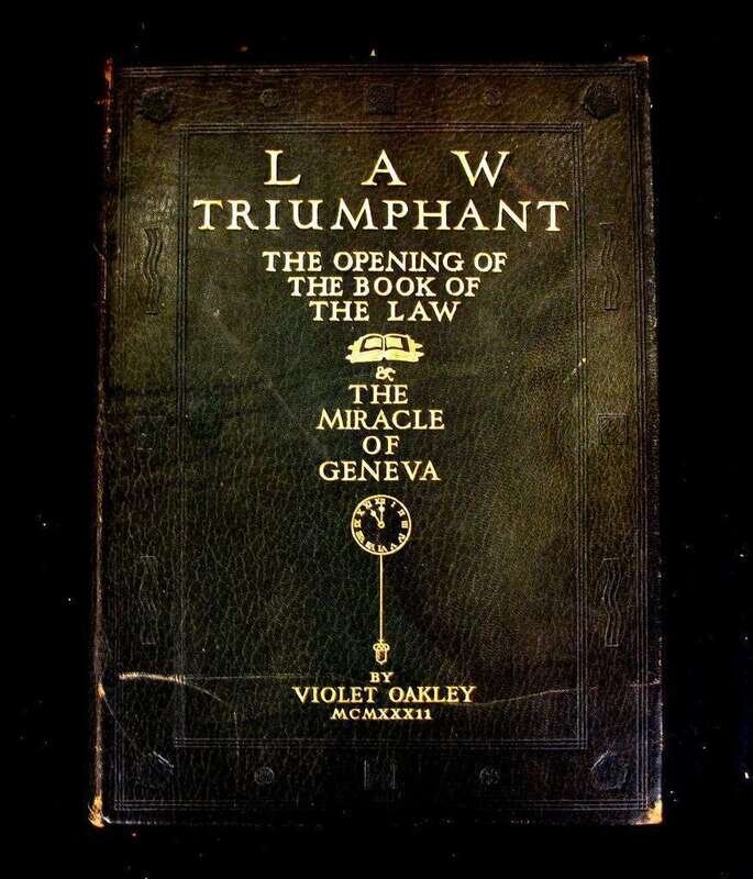 (Americana : The New Woman). 1 vol. Oakley, Violet. Law Triumphant. N.p., (1932). #201/300, signed by Violet Oakley. Folio, original gilt-lettered green pig skin , untrimmed edges; occasionally scuffed, corners and spine ends rubbed. With 71 hinge-mounted color and tinted plates. With calligraphic ink presentation "to Mary Alice Smith " by the author." Damp stain to top edge, often extending into top margins and encroaching upon the top of a few plates.