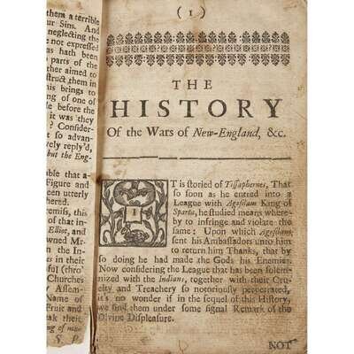 Evans 2796; Sabin 59645, "... ranks among the rarest of New England imprints;" Howes P-201, "Best early summery of New England's Indian troubles;" Church 904, Field 307.